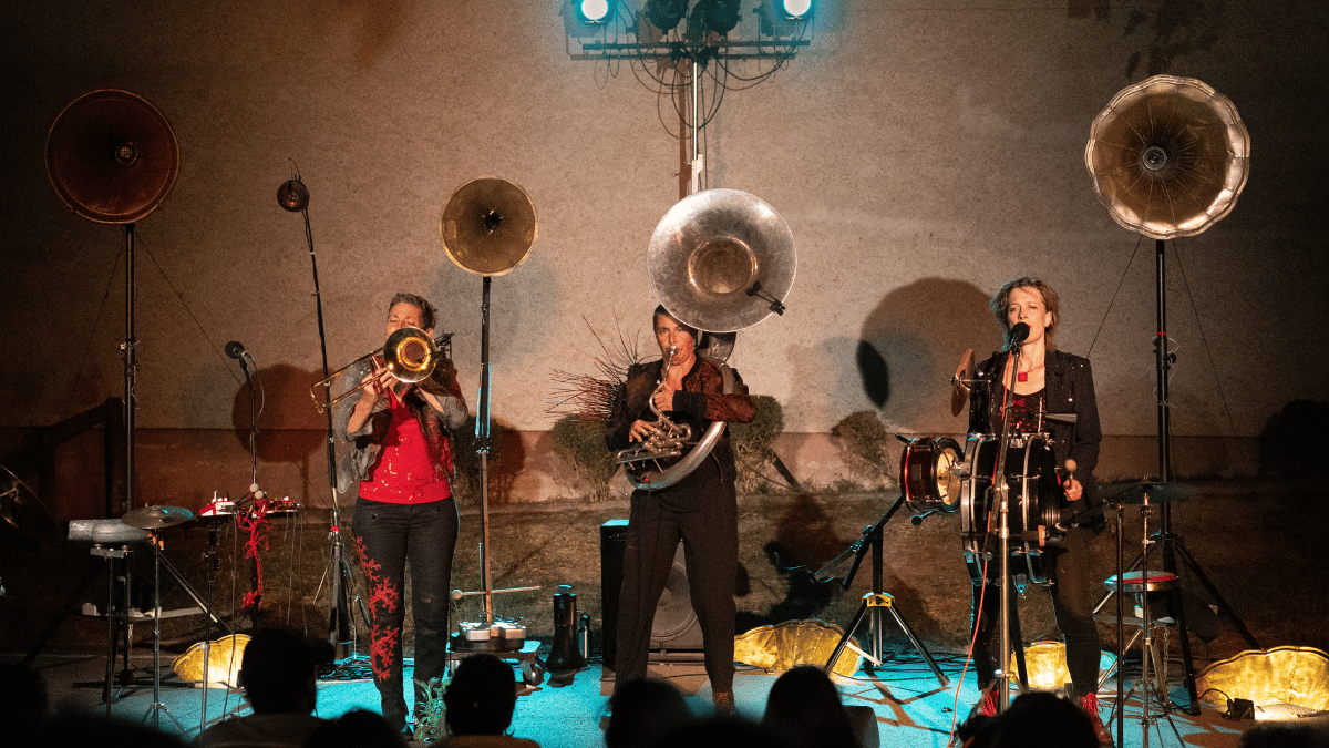 Elles sont trois, et elles vous cueilleront comme un champignon. Trois femmes-orchestres qui manient l’humour, le trombone, le tuba, la bricole, et qui convoquent des émotions ancestrales et un futur imminent. Voyage dans le temps et dans le son, elles parlent de monde à monde. « Au cœur d’une mécanique faite-maison, des pavillons de gramophones, des enceintes volantes et des effets distordants sont manipulés à vue ». À l’aise dans les grottes, les forêts, la ville, elles répandent dans toutes les oreilles leurs douces intentions : faire sonner les relations, par le chuchotement, le punk endiablé, le lyrico-poétique.