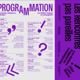 Trois mois de programmation, des ateliers participatifs, des spectacles tous public, scolaires ou en EHPAD, un soutien de la Région Auvergne-Rhône-Alpes, des partenariats riches et féconds avec des collectivités et des structures de l’Allier, de la Loire et du Rhône : Les Rencontres pas pareilles, c’est un projet qui porte les arts de la rue et le théâtre au plus près des publics. C’est un « ouvroir » d’expériences de proximité en zone rurale, qui favorise l’émergence de nouvelles expressions artistiques en interaction avec les territoires et leurs habitant·es. Les Rencontres pas pareilles, c’est une programmation pensée par les Ateliers Frappaz, des espaces de rencontre, des actions de médiation, de participation citoyenne et de démocratisation culturelle. Car les arts de la rue s’adressent à toutes et à tous. Ils n’ont ni âge, ni genre, ni origine sociale ou géographique. Ils sont vous, ils font nous.