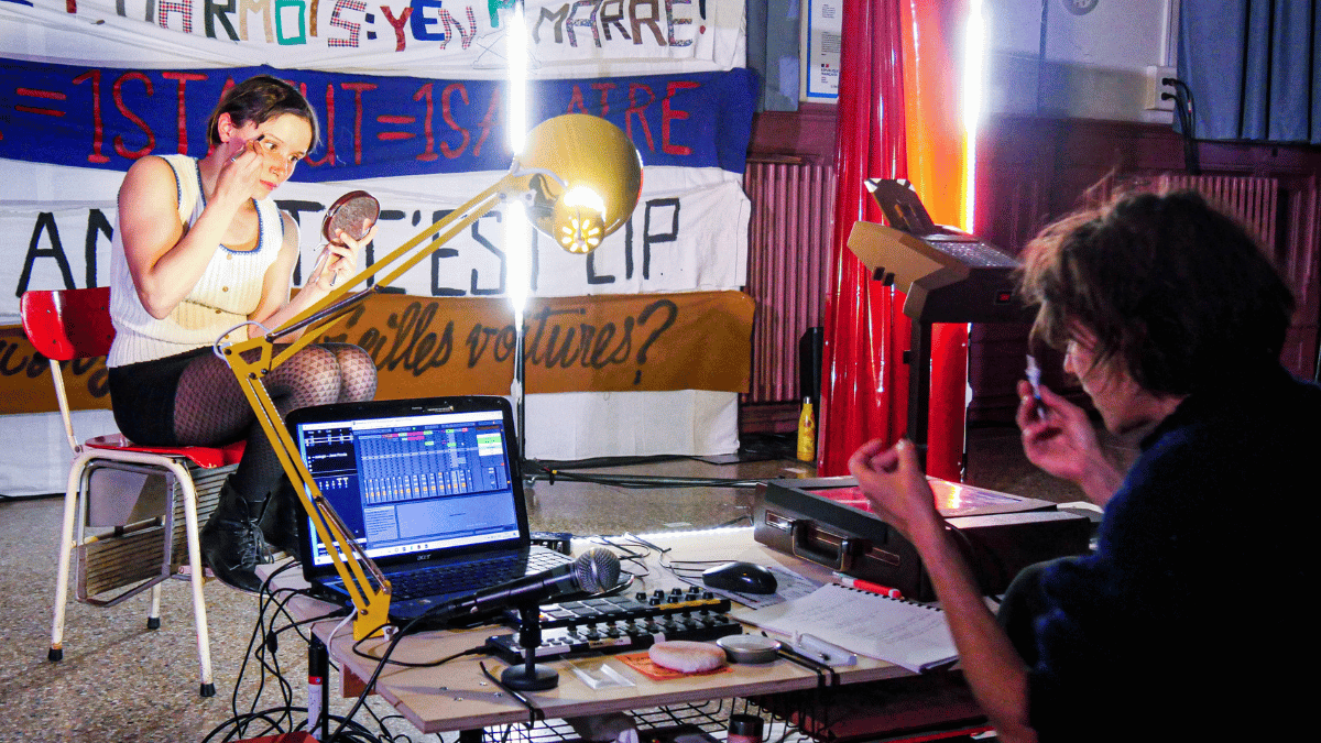 Le collectif Marthe a porté à la vie ces combats, dans un dispositif ingénieux et ultra-léger conçu d’abord pour la salle (le spectacle a été vu, dès 2022, au théâtre du Point du jour à Lyon, au CDN de Montpellier, à la MC2 de Grenoble…). Dans ce spectacle largement salué par la critique, les comédiennes se griment et interprètent en direct les captations de Carole Roussopoulos. La succession de personnages marquants, de Jane Fonda à une militante du PHAR, en passant par une ouvrière de l’usine LIP en grève, retrace les luttes féministes dans une virtuosité simplissime.