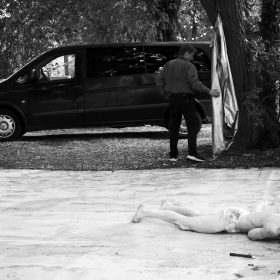 Les actes commis sur le corps sont performatifs. Chaque étape des processus de mise à mort, résurrection et de métamorphose du corps sont données à voir. En maltraitant Théodule, l’artiste se met en scène comme le tortionnaire et bourreau. Il raconte par ses gestes et les images qu’il créé, une histoire de la violence humaine ; l’objectivation d’un corps, jusqu’à son anéantissement. Théodule, pris dans ce cycle interminable de vie et de mort, communique, par son corps, sa présence et ses regards, établit un contact avec la foule. Chaque réveil dévoile une nouvelle facette de son être ; il s’ouvre de plus en plus, jusqu’à prendre la parole et dire son monde. Le travail corporel de Thomas Mardell crédibilise les états physiques extrêmes, de la rigidité cadavérique jusqu’au burlesque. Théodule est un spectacle comme une farce, où le sérieux côtoie la dérision. Comme des enfants, jouer à la violence et à la mort, pour les tenir à distance et les apprivoiser.
